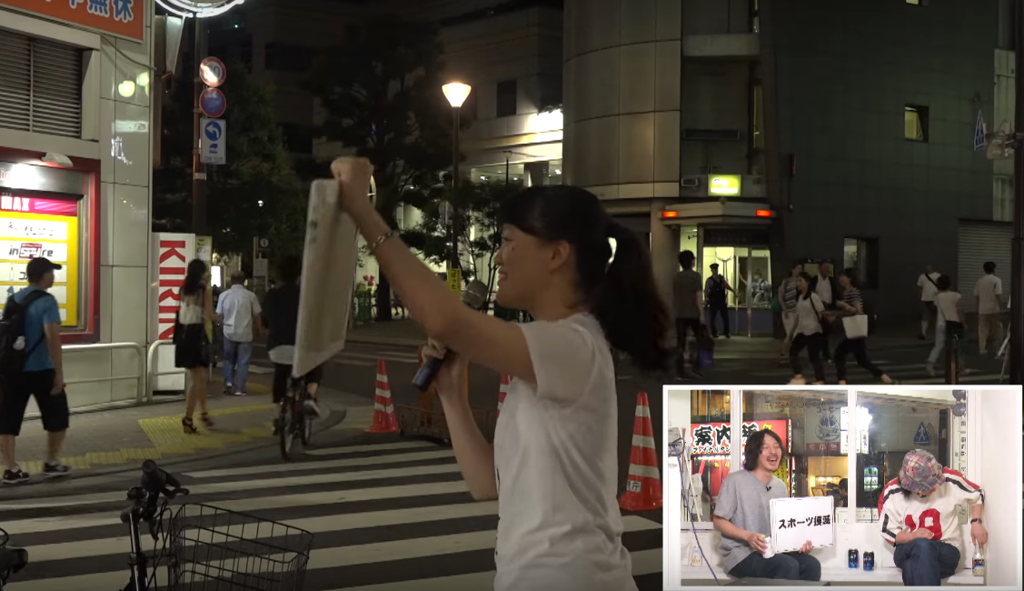 街ゆく人々に「スポーツ好きですか?」「なぜ好きなんですか?」と街頭インタビューし、「スポーツは危険なのでやめましょう!」と呼びかけるパフォーマンス。